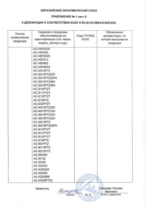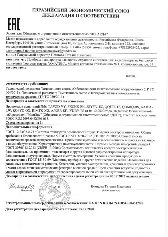 IP видеокамеры Amatek. Декларация соответствия Таможенного союза (EAC) (2020-2023)