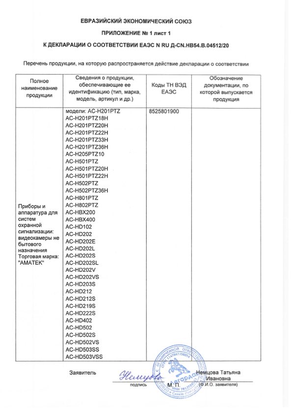 Видеокамеры Amatek (PTZ). Декларация соответствия Таможенного союза (EAC) (2018)