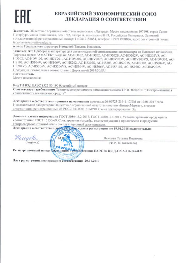 IP видеокамеры Amatek. Декларация соответствия Таможенного союза (EAC) (2018-2021)