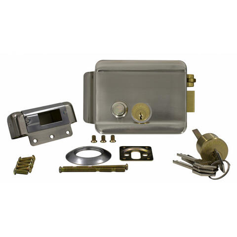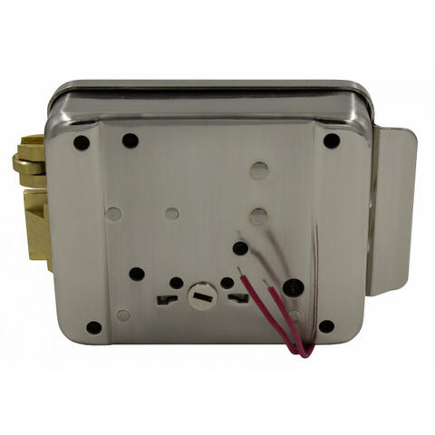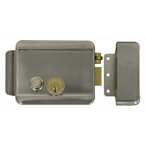 Электромеханический замок, накладной, универсальный (дверь наружу, внутрь), ролик взвода пружины, блокировка ключом в закрытом состоянии, никелированная сталь, 12В, цвет серебро.