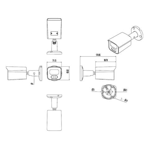 1/2.7" SC8238, SSC338Q, MJPEG/H.264/H.264+/H.265/H.265+, макс. разрешение 3840*2160@20fps. Объектив 2,8мм. ИК подсветка дальностью 30м. Встроенный микрофон. ONVIF 2.4, WDR 120дБ, 3D NR, BLC, ROI, Defog («антитуман»), 3 приватные зоны, коридорный режим, детектор движения. Внешний слот для SD карты до 512Гб. Питание: PoE (IEEE 802.3af) / DC12В 700мА.  IP67, рабочая температура: -40...+60°C, размеры 72x66x175мм, вес 850 г. Приложение BitVision.