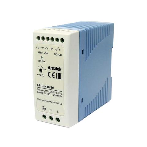 AP-DIN48/60 - блок питания 48В/1,25А стабилизированный (аналог MDR-60-48). Источник вторичного электропитания предназначен для обеспечения электропитания потребителей с номинальным стабилизированным напряжением 48В и током потребления до 1,25А.