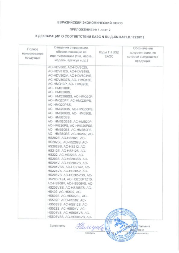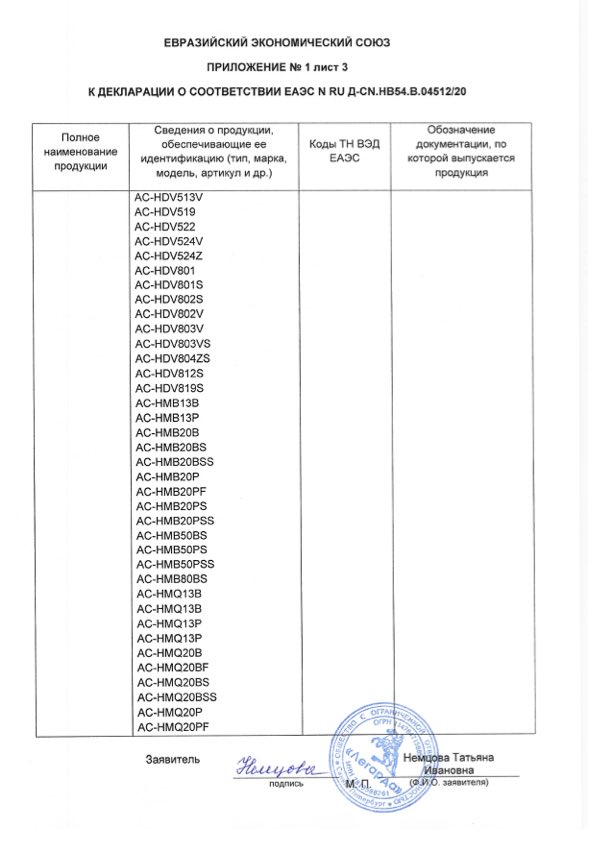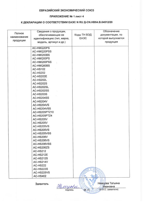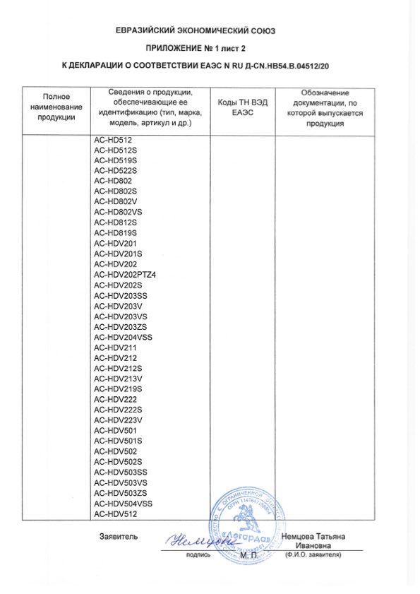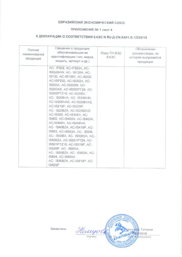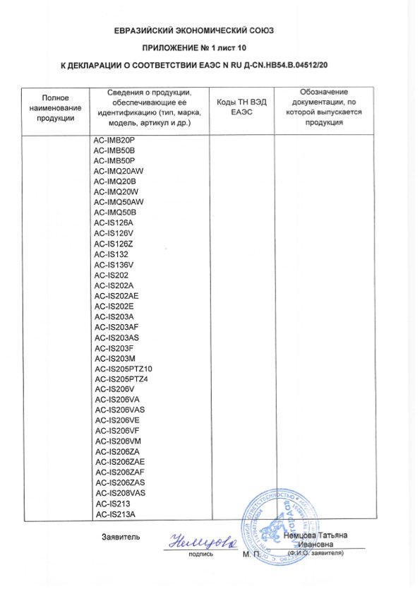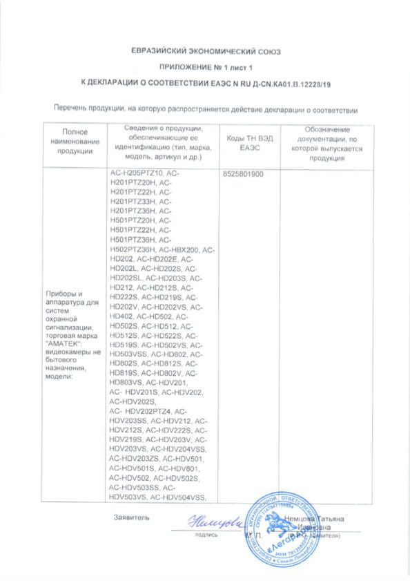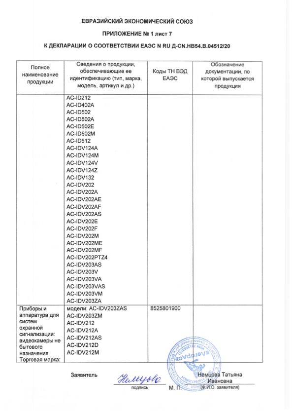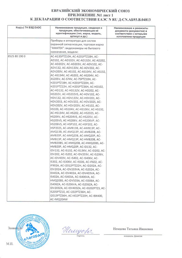 IP видеокамеры Amatek. Декларация соответствия Таможенного союза (EAC) (2020-2023)
