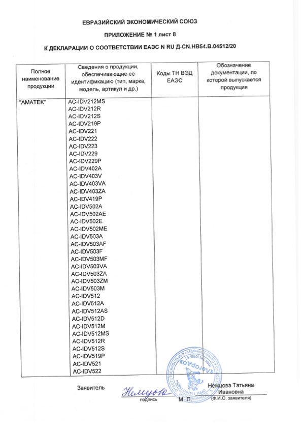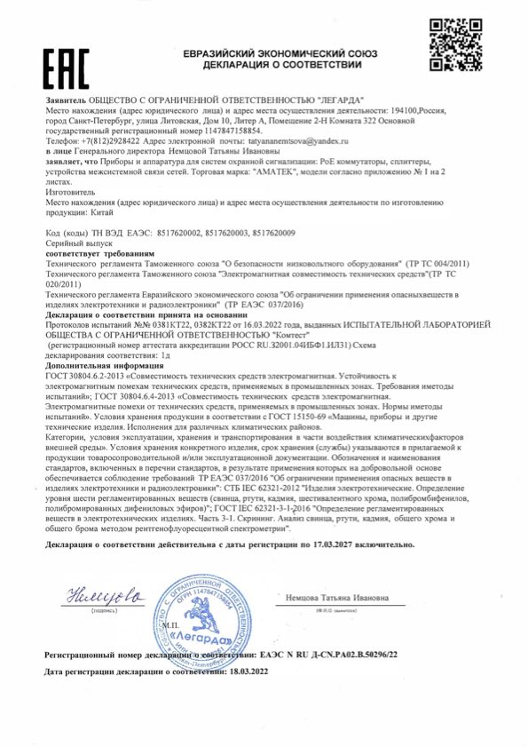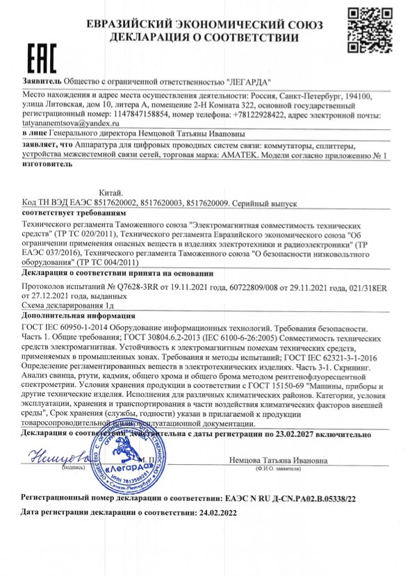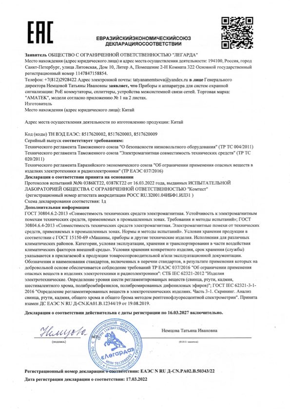 Коммутаторы и IP аксессуары Amatek. Декларация соответствия Таможенного союза (EAC) (2022-2027) v.2