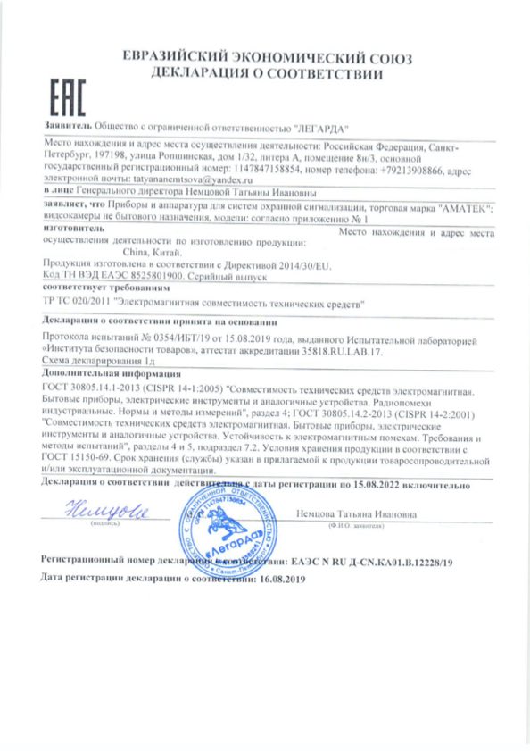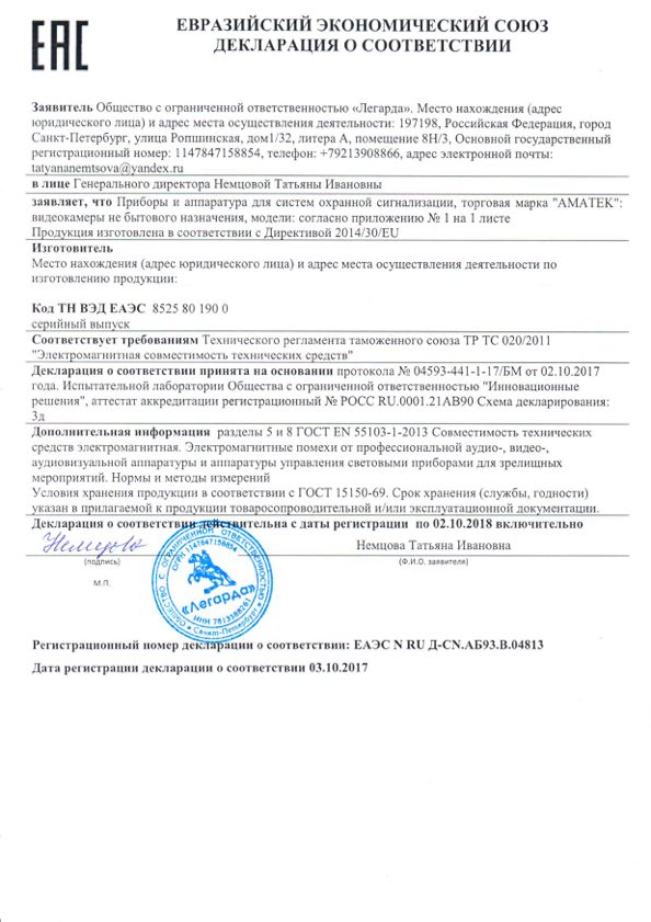 Видеокамеры Amatek (№1). Декларация соответствия Таможенного союза (EAC) (2018)