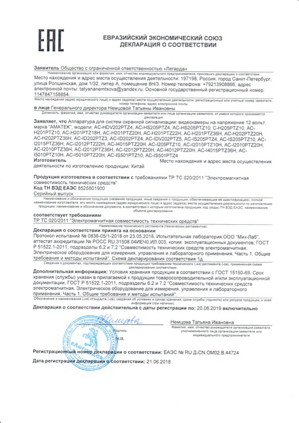Видеокамеры Amatek (PTZ). Декларация соответствия Таможенного союза (EAC) (2018)