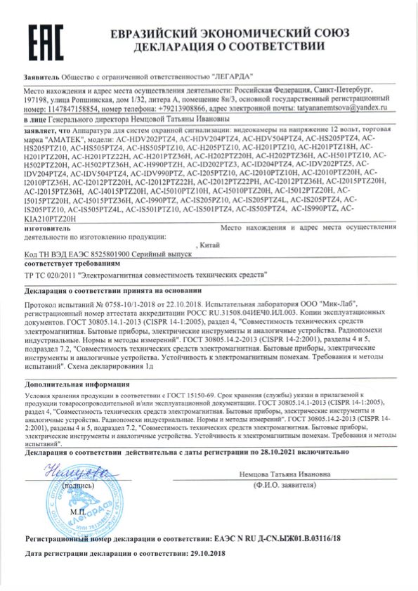 PTZ видеокамеры Amatek. Декларация соответствия Таможенного союза (EAC) (2018-2021).