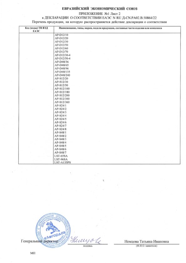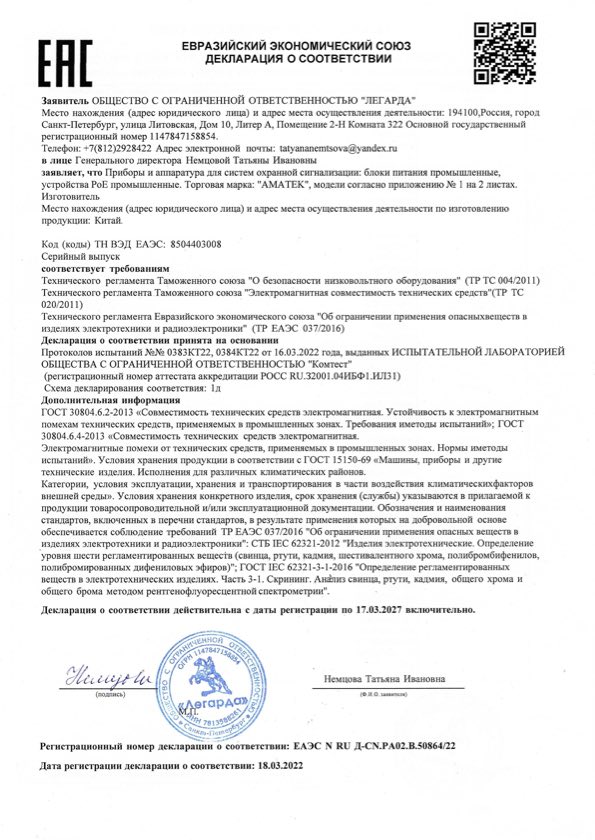 Инжекторы PoE Amatek. Декларация соответствия Таможенного союза (EAC) (2022-2027).
